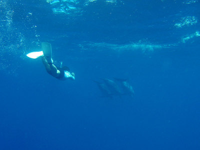 その後、少し船を走らせる。なかなか発見できないな〜なんて思っていたその矢先、イルカ発見!波間に見える背びれでわかるのだ。他にスイム船はいない。そぉっと入水する。