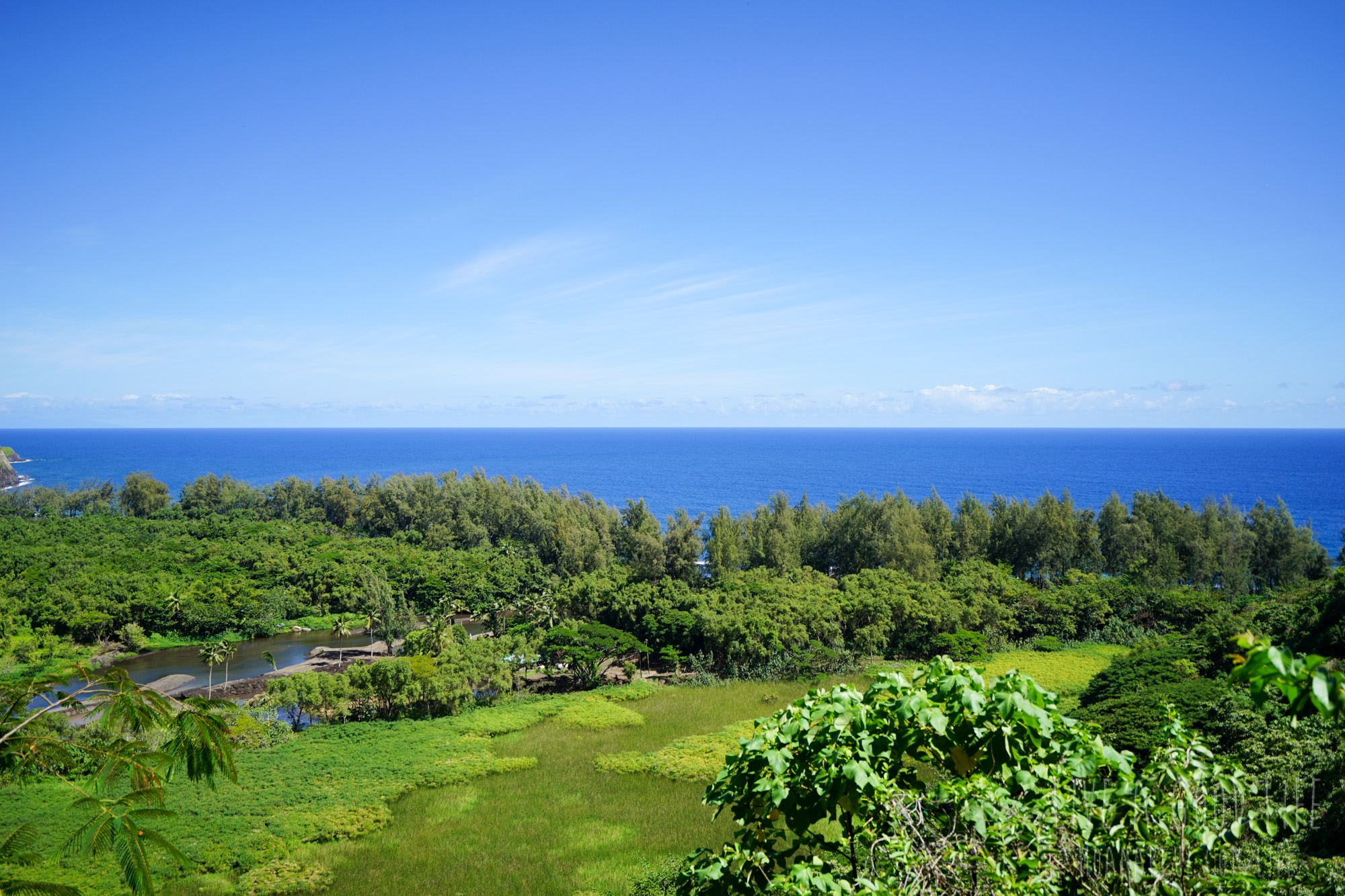 川の先に海が続いてます。川の水を利用してタロイモ(里芋みたいな古代ハワイの主食:ポイをつくる原料になるイモ)を栽培しています。