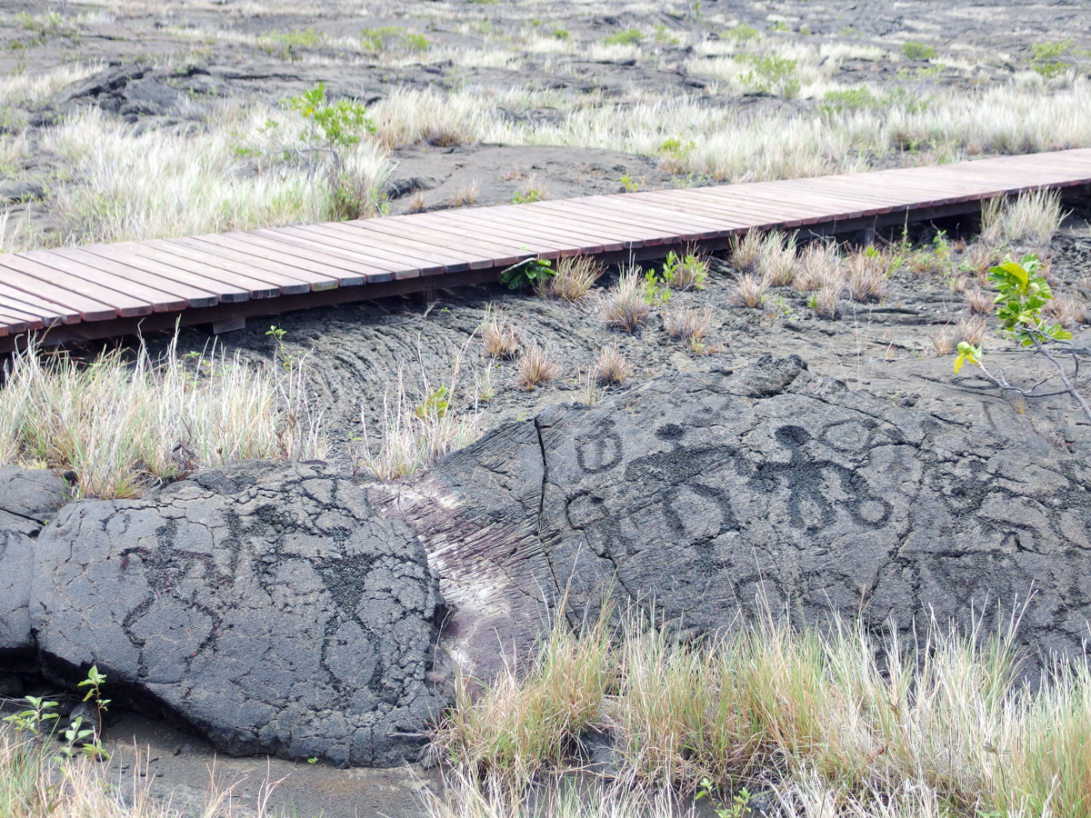 ペトログリフというのは、古代の人間の落書きみたいなもので、象形文字ともアートとも言われています。ハワイのそれは比較的新しく、数百年前レベルのこともあるそう。 ハワイの人たちは文字をもたない文化だったので、フラのような踊りやこうした絵柄でコミュニケーションを図っていたのでしょうね。